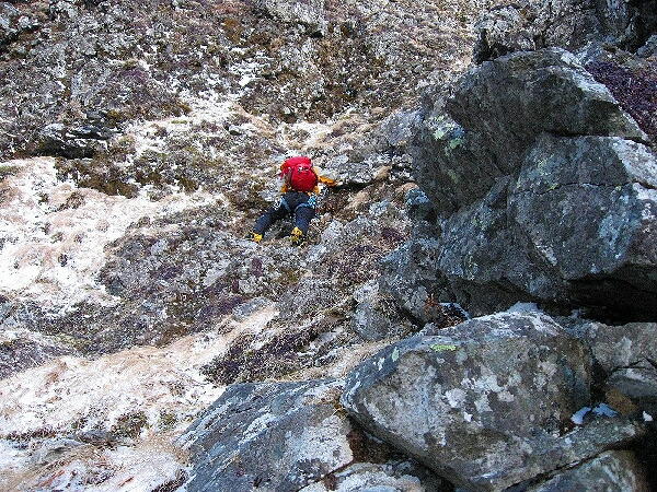 草付が出てきたら、それに導かれること無く、少し右上気味に登るのが正解。草付にアックスがシッカリと利いた状況から、突然細かい岩登りになるので、ちょっとビビリますが、落ち着い