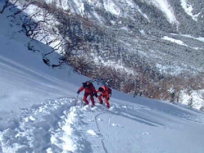 お次は上のルンゼ(沢筋)からよく雪崩れてくる箇所での、深雪のラッセルです。