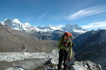 クルシ〜!後方右の、谷の中がBCです。バックは左から「ワンドイ」、そして「ピスコ」に「チャクララフ」