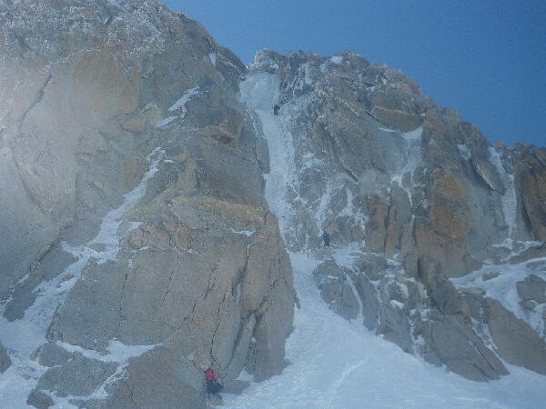 正面の雪田を登るラインがクラシックルートのコンタミヌ・マゾット。右バットレスの右の顕著な氷の筋がシェリークーロアール。