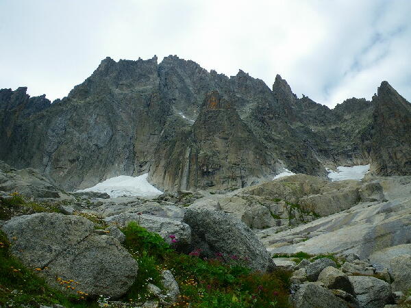 2011年7月15日 ![]() 4時起床。 けれど依然として深い霧は晴れぬまま。 「グレポン」だけでなくシャモニを代表する名クラシックである「東壁・メールドグラスフェイス」へ行くパーティーはルートが易しいこともあって、出発していったが、同じグレポンの頂上を目指 すにも「ソレイユ・ランデブー・アベック・リュヌ」その名も「太陽と月のランデブー」という、ミシェル・ピオラが開いたモダンルートを選択した私たちは、流石に岩が濡れていると待たざる得ない。 2時間待った。 夜明けとともに霧が引いてくる。 雪上のアプローチを除いても、ルートの全長は850b25ピッチに及ぶから、夜明け前に出発できなかった時点で山頂を踏むことは既に諦めなければならない。それでも行けるところまで 登ることに決めて出発する。 取り付きは雪が大きく割れたシュルンドで、恐る恐る壁に移る。 初めから数ピッチは、かなり濡れている。 しかもムッシュ・ピオラ・・・常識的な弱点は突かず、困難なフェイスにばかり、しかもワザワザ導いてくれるのだから困ったものだ。 彼はスラブ愛好家なのだろうか? ![]() どこまでも続く壁 右に2度目の流れを渡った左上の辺りから、面倒になったのか?フェイスなのにボルトがどんどん減っていく。いや、難しくはないので支点としてのボルトは要らないが、これではルートファ イティングが兎に角難しい。 合理的なライン、弱点を登ってはいけないのである!。 常識的な自然なラインで登ると、支点の取りやすいクラックラインに移動してしまい、しかも大きくルートを外れてしまうのだから始末が悪い。 何処でも登れそうな広いスラブで、上かと思えば登った横や下にボルトがポツンと打ってある。 そこしか取れないクラックに支点を取ってから、気合いでランナウトしていくと、「あれぇ、何故?」気が付くと、探し求めていたはずのボルトが横にある・・・・ 各ピッチはそれぞれ傾斜の強さを持っていて、しかも長い。全てが45b前後で、40b以下のピッチなど、ほとんどないのだ。 ![]() 上に行くに従って、ルートの性格はスラブからクラックに変わる(ココ、実はかなり傾斜あります!) ルートの性格は上部に来ると共に、ボルトは無くなりカムだけのクラック・クライミングに変化してくる。 1ピッチが長いのでギアもカム1セット以上使うことがある。荷物は最小限と言っても、二人分の水もあるし、やはりそう軽いものではない。 全長のあるルートだけに、軽装で取り付くわけにもいかず、ほとんど5.10以上のグレードの80度前後ある傾斜を、荷物に引かれ、重力に逆らいながら登るのは厳しい (トポに載っているグレードよりも、例えばミディ南壁レビュファより、先日登ったもっとグレードの高いはずのナンチョン1より難しい!)。 弱点を巧みについて、それほど困難を伴わないクラシックルートであれば、もう頂上に迫っている頃だろう(クラシックは8時間ほどで登れる)。 しかも、クラックのラインになっても「これはいいサイズだ!」とジャミングを決めに行った手を、慌てて引っ込めることは度々だ。 中がベッタリと濡れているのだから・・・ それでも、度々迷いつつも、何とか20ピッチに近づいてきた。 けれど東壁の日が陰るのは早い。しかも今年は夏としては気温が低いので、陰になった途端に急速に気温が下がり始める。 屈曲したこのルートの下降は、正確に登ったルートを辿るわけではないので、日が暮れれば降りられなくなる。下降もルートファインディングが必須なのだ。 グレポンの城壁のような頂上稜線の岩壁が近くに見えているが、タイムアウト。 これ以上登れば小屋の夕食に間に合わなくて迷惑を掛けるのはまだしも、何処かでロープでも引っかければ、今度は日没にも間に合わなくなる。急激に気温の下がりつつあるテラスで、 二人頷きあうと、休む間もなく下降へ移った。 ![]() 城塞のごとくそそり立つ、グレポンの頂稜岩壁を、口惜しく眺めながらのラペル(アッという間に城塞は遠ざかっていく) 懸垂下降は少しでも効率の良い方法で、次々と下って行ったのだが、直線ラインでの下降ではないだけに末端を引っかける可能性が高く気を使う。途中雪渓を渡ったり、ラインから外れた 支点を探す必要もあり、少なくとも650b以上は登っているのだからなかなか降りきらない。3時間半もの間、ひたすらにラペル(懸垂)を繰り返した。 ![]() やっとのことで取り付き(もう周囲は陰り始めている) 上部でコールが聞こえて、一般ルートを仰ぐが、私には視認出来ないほど遙か遠くに居る彼らは、まだ頂上へは着いていない。彼らはビバークの可能性が濃くなり始めて、焦っていること だろう。 取り付きで再び、靴とアイゼンを履き、確保しあってシュルンドを越えた。 日没には充分間に合ったが、それでも小屋へ戻るパーティーは、まだ氷河上に何組かの後続がいる。 ![]() 岩と氷河のはざま、割れ目を「シュルンド」と呼ぶ(雪が緩んで朝よりも、ちょっとドキドキ!